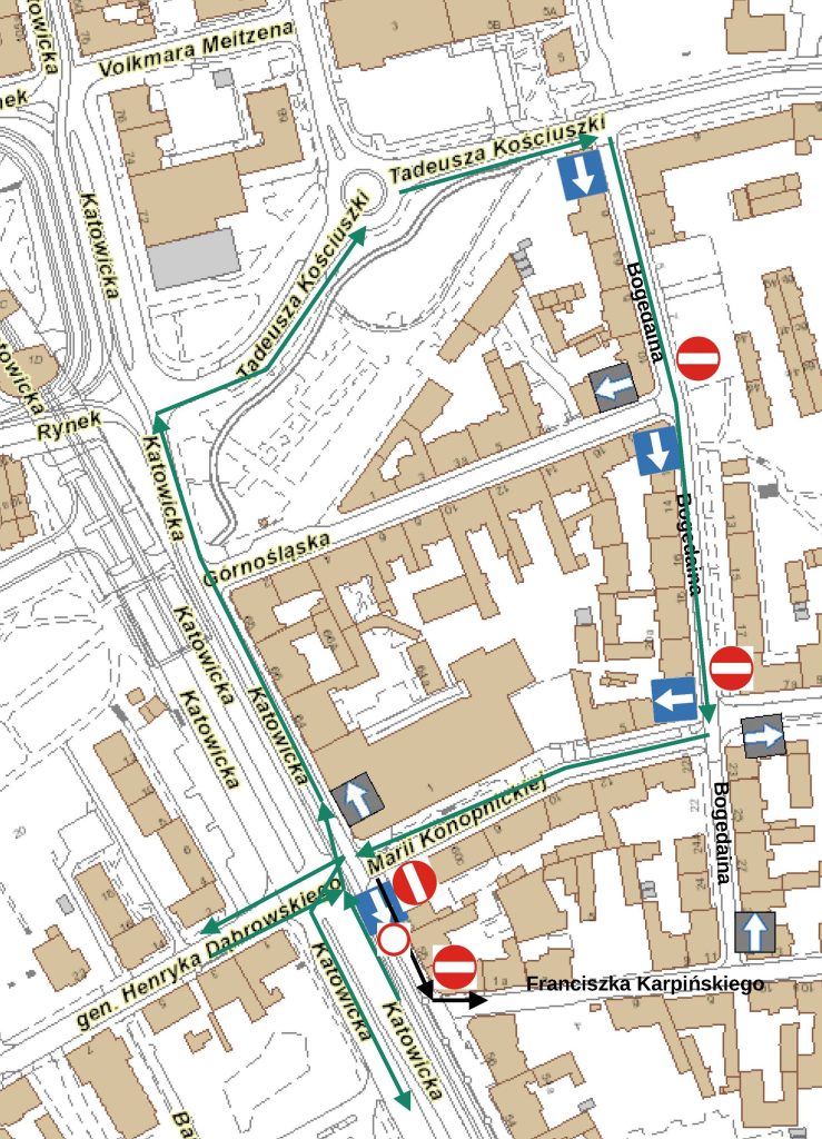 3. Ruch pojazdów z ul. Katowickiej oraz z ul. Dąbrowskiego z uwagi na zmianę kierunku ruchu ul. Konopnickiej zostanie poprowadzony ul. Katowicką (stary przebieg) do ul. Kościuszki, a następnie ul. Bogedaina do ul. Konopnickiej.